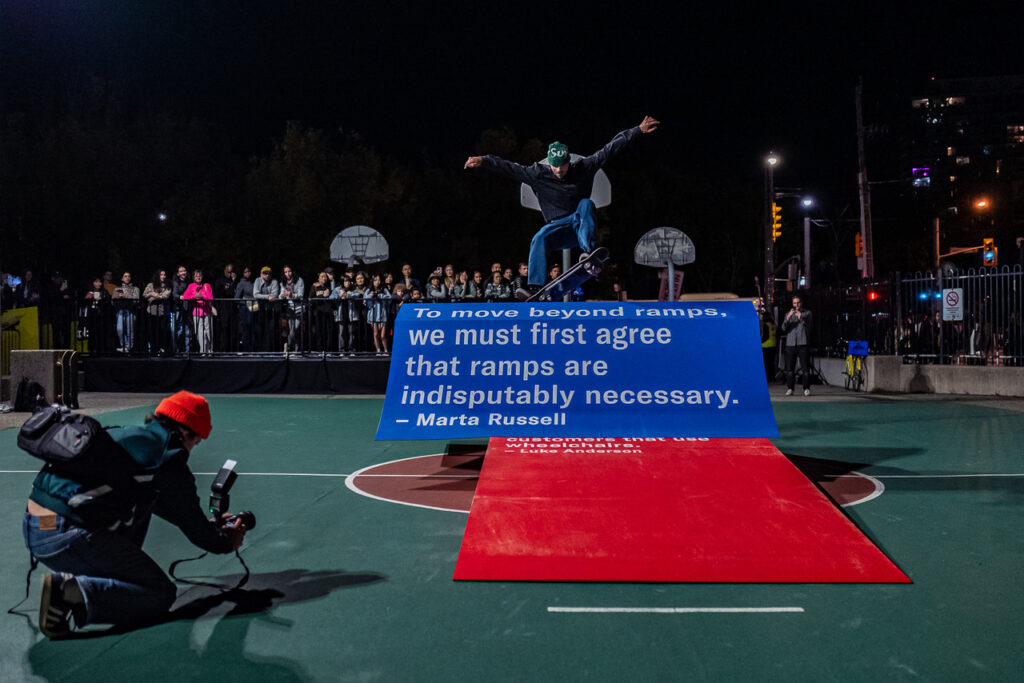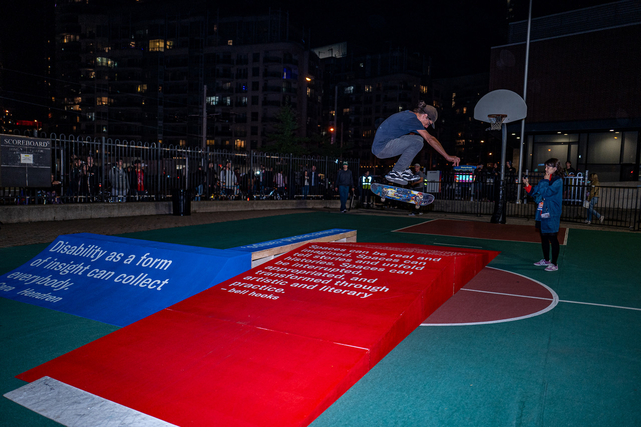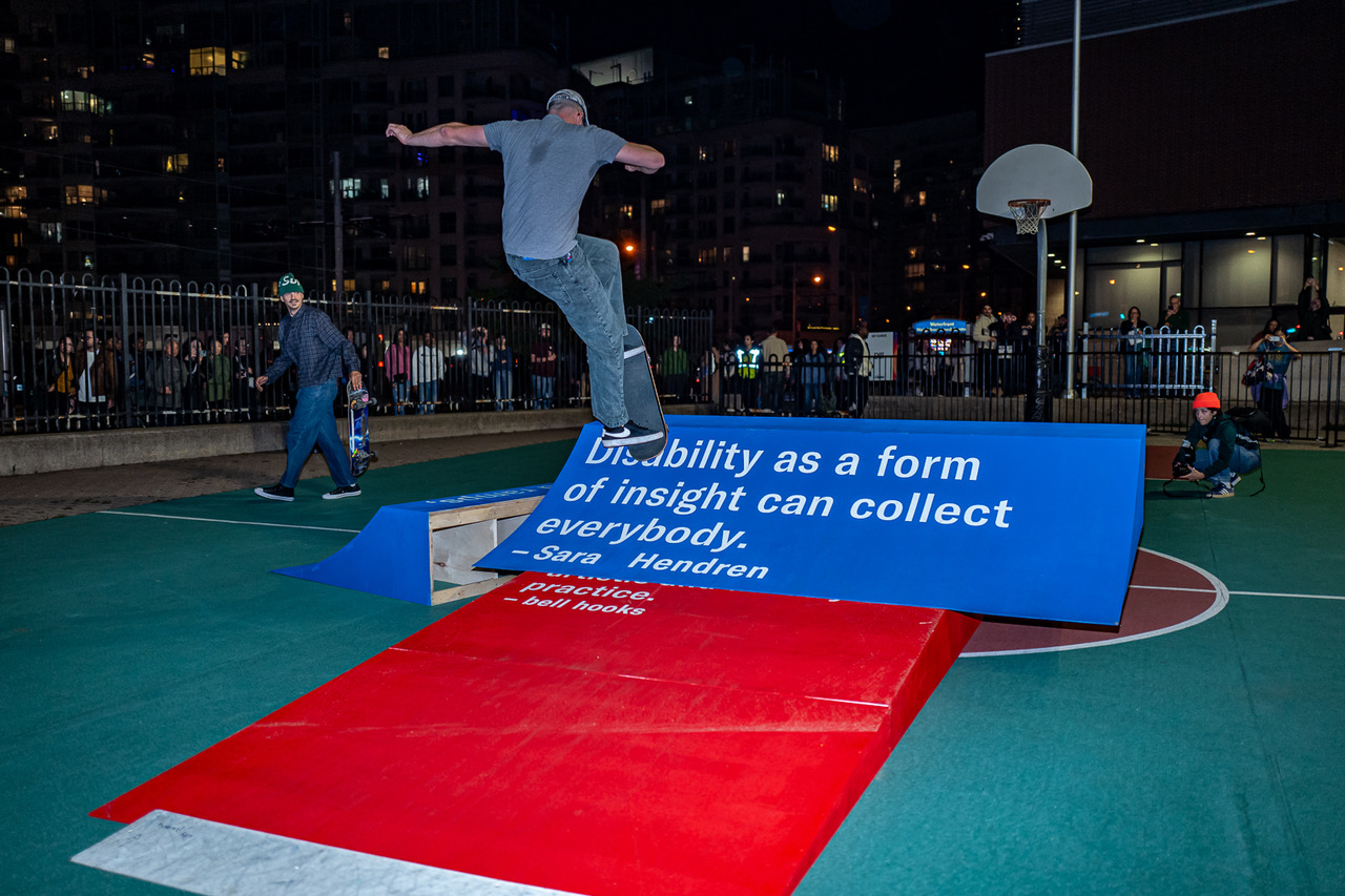 Atanas Bozdarov and A.S.M. Kobayashi explore urban accessibility infrastructures and their use by both the disability community and skateboarders. This public installation features a custom-built, Accessibility for Ontarians with Disabilities Act (AODA)-compliant ramp that invites audience members to walk on and engage with a series of texts composed along the ramp’s surface. Additionally, the installation also incorporates a series of skateboarding ramps, similarly adorned with text, which will be activated by users with wheels. The ramps are designed in collaboration with the StopGap Foundation, drawing inspiration from their portable, colourful accessibility ramps, which inject a sense of play and levity into the typically rigid constraints and barriers of the built environment. Quotes from writers, artists, practitioners, and activists, including in the disability and skateboarding communities, are displayed on the ramps and featured in an online video, where Bozdarov and Kobayashi read them aloud. These curated reflections further emphasize the intersections and commonalities between the disability and skateboarding communities. These conversations provoke reflection on movement, access and inclusion, and touch on how these individuals have learned to be resilient and creative in their hacks and navigation of the spaces that actively exclude them. The intention of this work is for audiences to further engage in this dialogue and continue the projects’ ideas beyond the night’s temporary installation. “Rise Over Run” explores design for intersecting needs and was initiated by the artists’ observations of accessibility structures and their appropriation by skateboarders.