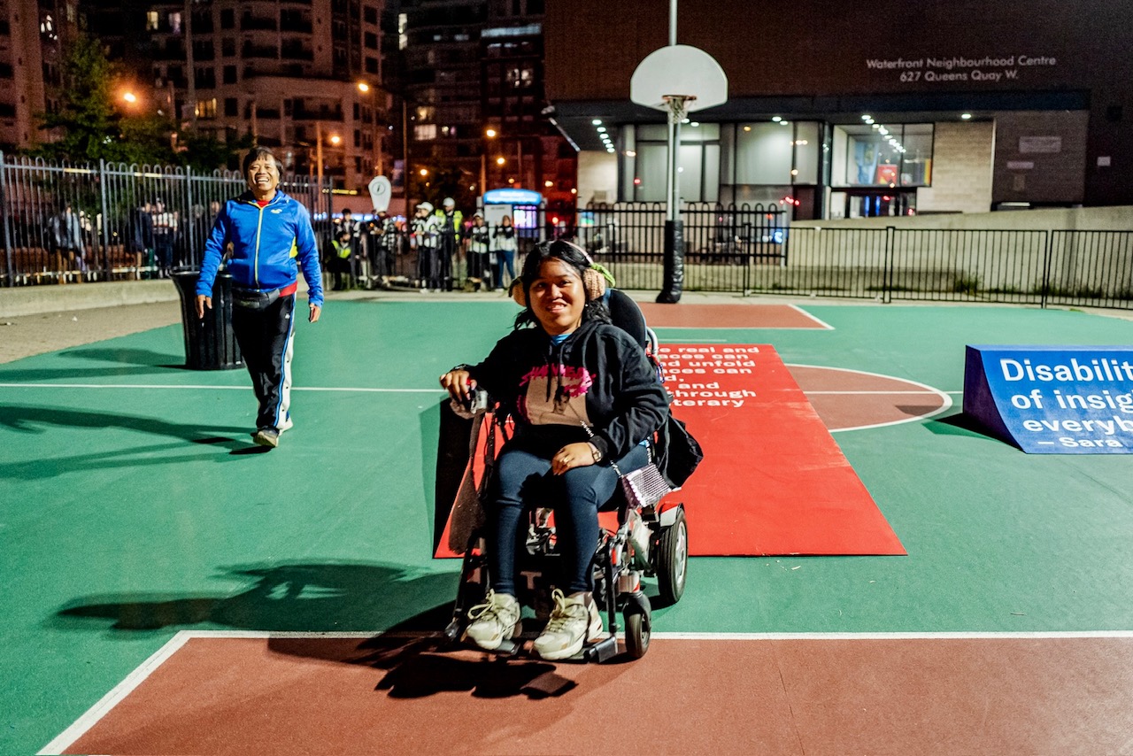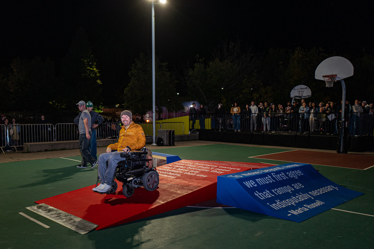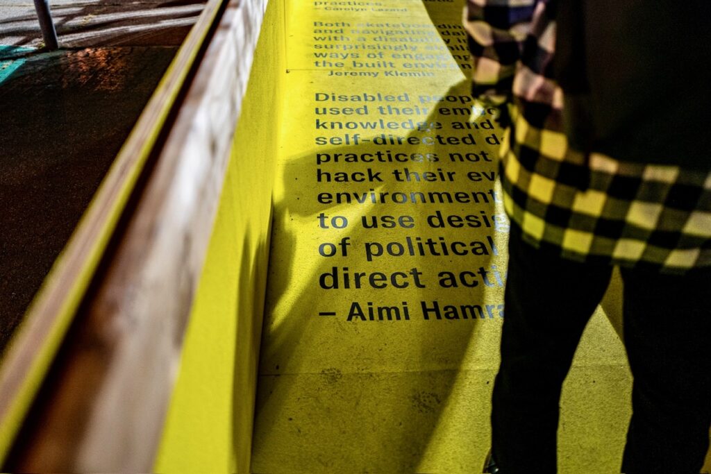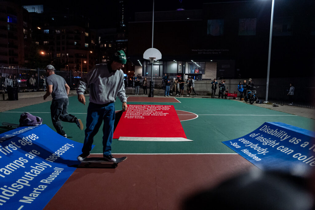 Atanas Bozdarov and A.S.M. Kobayashi explore urban accessibility infrastructures and their use by both the disability community and skateboarders. This public installation features a custom-built, Accessibility for Ontarians with Disabilities Act (AODA)-compliant ramp that invites audience members to walk on and engage with a series of texts composed along the ramp’s surface. Additionally, the installation also incorporates a series of skateboarding ramps, similarly adorned with text, which will be activated by users with wheels. The ramps are designed in collaboration with the StopGap Foundation, drawing inspiration from their portable, colourful accessibility ramps, which inject a sense of play and levity into the typically rigid constraints and barriers of the built environment. Quotes from writers, artists, practitioners, and activists, including in the disability and skateboarding communities, are displayed on the ramps and featured in an online video, where Bozdarov and Kobayashi read them aloud. These curated reflections further emphasize the intersections and commonalities between the disability and skateboarding communities. These conversations provoke reflection on movement, access and inclusion, and touch on how these individuals have learned to be resilient and creative in their hacks and navigation of the spaces that actively exclude them. The intention of this work is for audiences to further engage in this dialogue and continue the projects’ ideas beyond the night’s temporary installation. “Rise Over Run” explores design for intersecting needs and was initiated by the artists’ observations of accessibility structures and their appropriation by skateboarders.